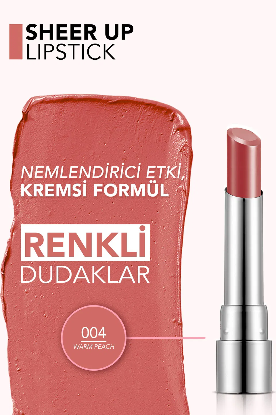 رنگ Warm Peach 004 از رژ لب Flormar Sheer Up یکی از جذابترین و پرطرفدارترین رنگهای این مجموعه است 💄. این رنگ ترکیبی دلانگیز از هلویی گرم با تهمایهی طلایی است که درخشش و گرمایی طبیعی به لبها میبخشد.